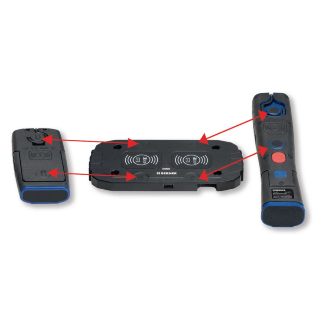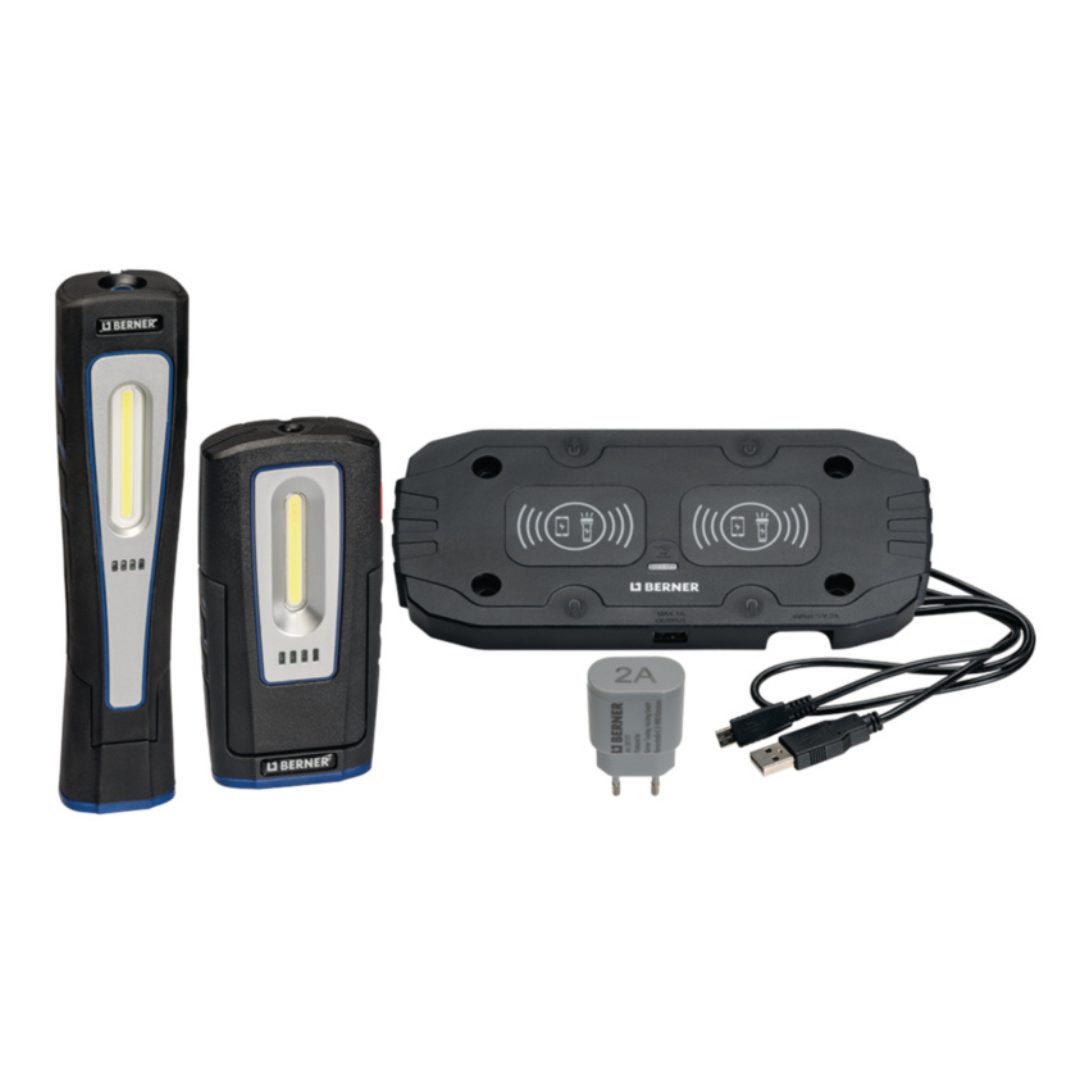 Kompletan sustav za bežično punjenje, uključujući dvostruku stanicu za punjenje s dodatnom opremom (kabel i punjač od 230 V, 2 A), zajedno s bežičnom džepnom svjetiljkom DeLux i bežičnom svjetiljkom X-Lux