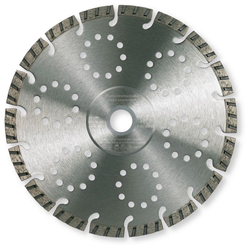 - U području prirubnice ojačana glavna oštrica za stabilne rezove, postupak vrućeg prešanja sinteriranja za vrlo dobru i trajnu vezu segmenta i glavne oštrice, bušeni glavni nož za hlađenje segmenata i povećanje vijeka trajanja